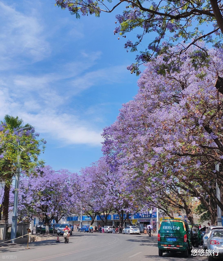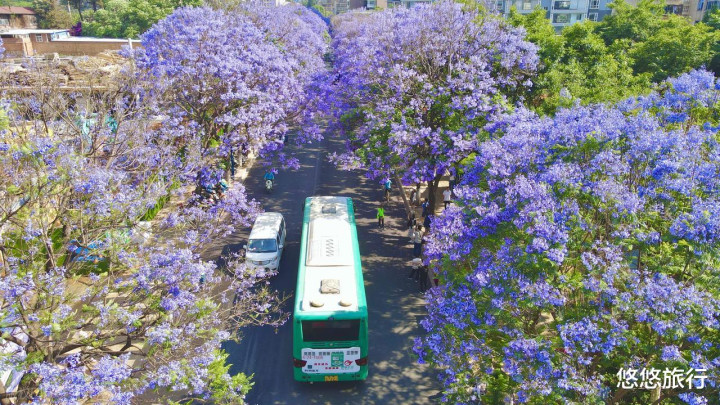 这是国内蓝花楹最多的城市之一,4月中下旬,全城近5万余株蓝花楹纪律洞开,蔚为壮不雅。