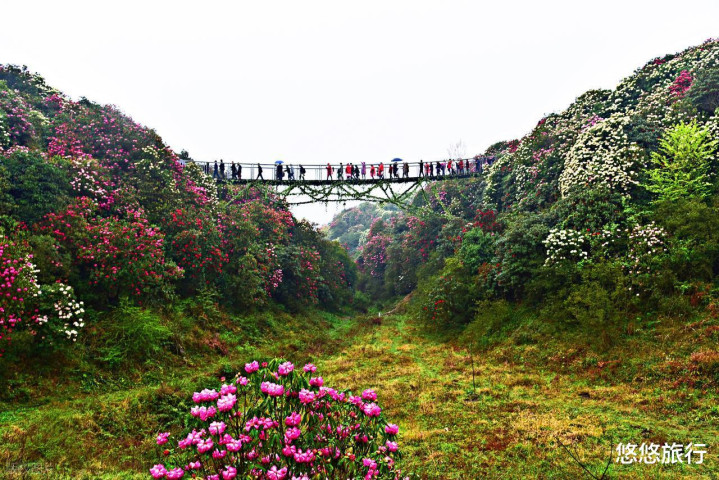 金坡景区千里浸式走入花中瑶池,百花坪似锦蜂拥,一步一景。万花楼将成片杜鹃尽收眼底。索玛花桥悬于花海之上。