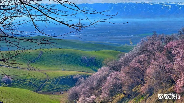 中叶纪留传的野杏林,吐尔根杏花沟粉色花海与雪山草原交汇。4月上旬是最好不雅赏期,杏花从山脚膨胀到山顶,像一派粉色的海洋。大西沟杏花与野果花交汇,花期在4月中旬。