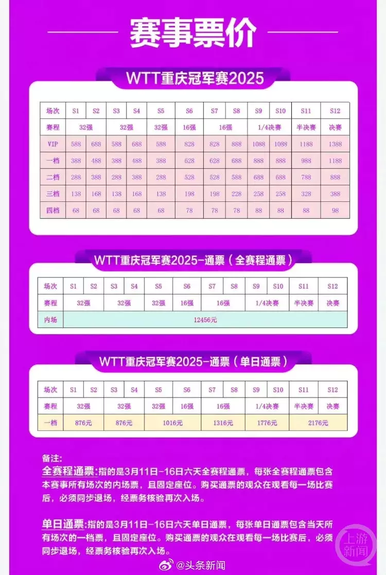 笔据票务网站融会,WTT重庆冠军赛门票18日开票,上架一天便售罄,门票最高票价为12456元。