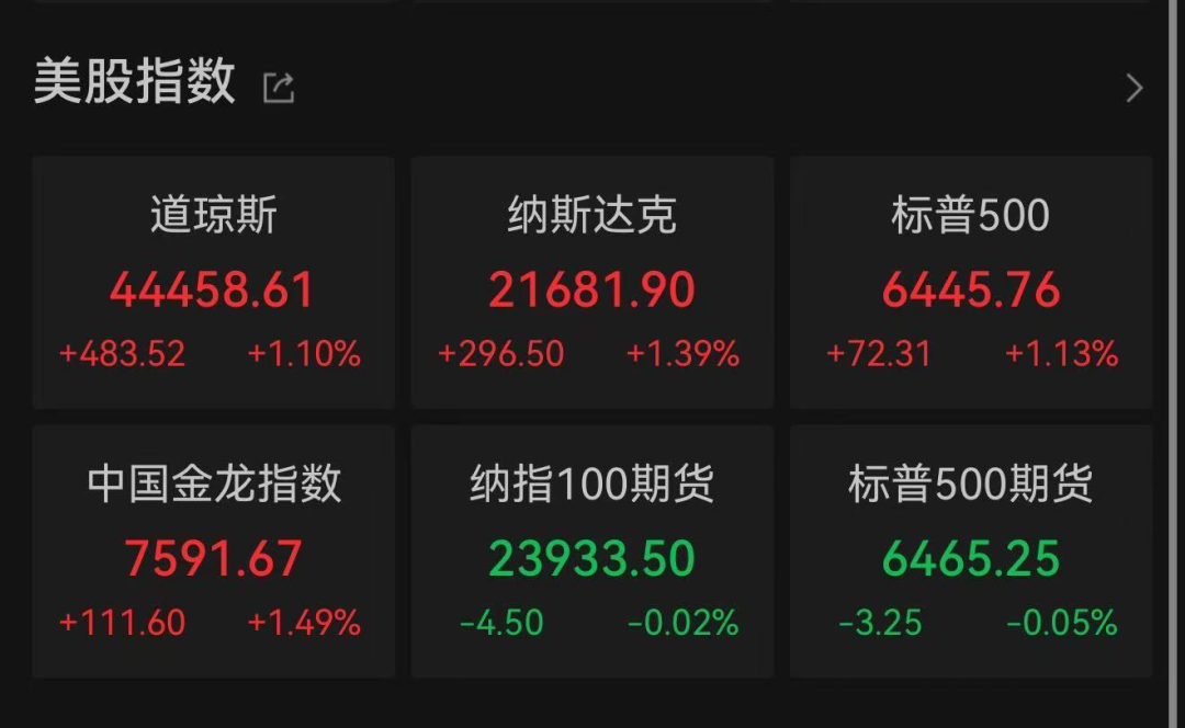 放置收盘,标普500指数飞腾1.13%,报收于6445.76点;纳斯达克详尽指数飞腾1.39%,报收于21681.9点;谈琼斯工业指数涨1.1%,报收于44458.61点。