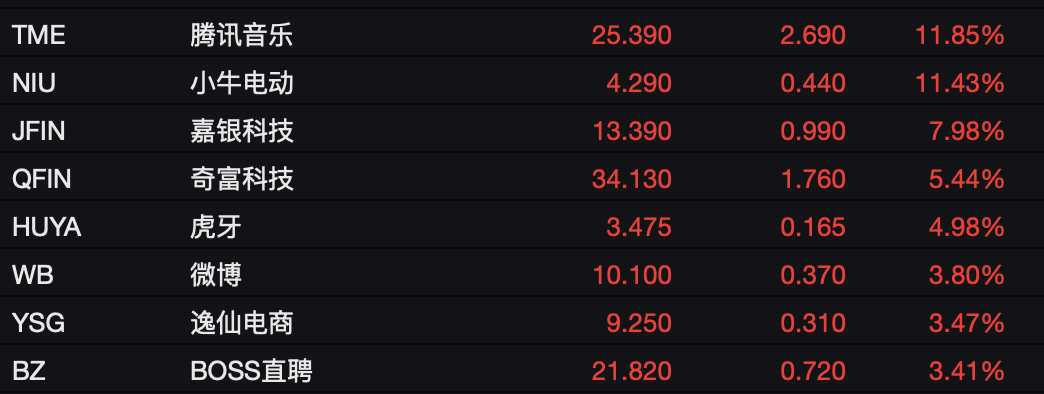 腾讯音乐、小牛电动涨超10%,奇富科技飞腾超5%。