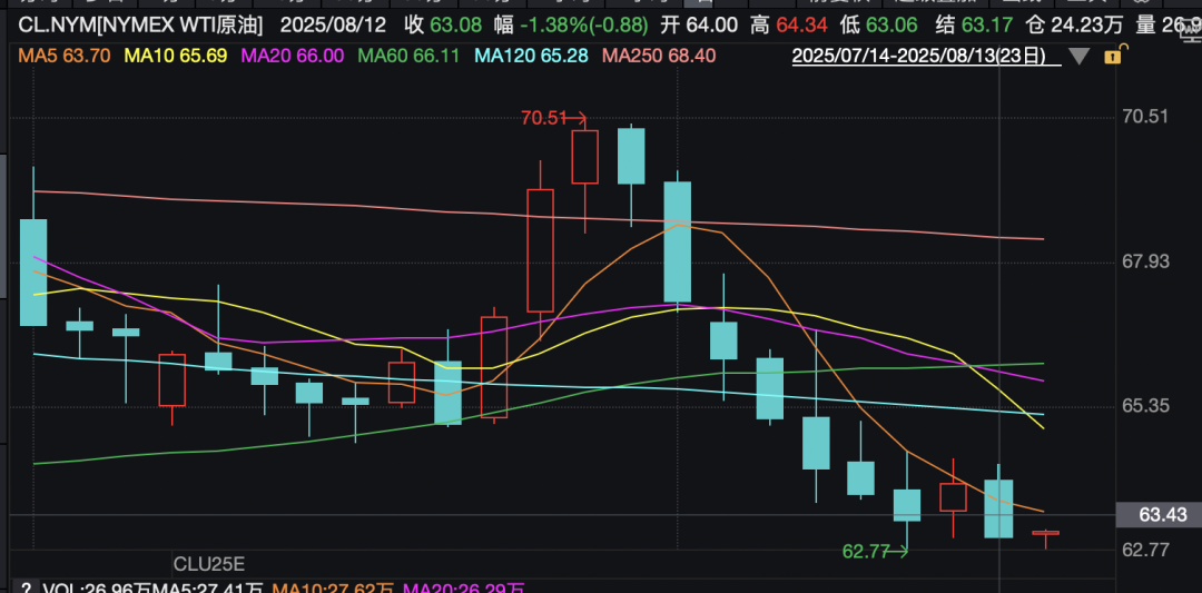 海外油价下降,NYMEX WTI原油下降1.38%,收于63.08好意思元/桶。