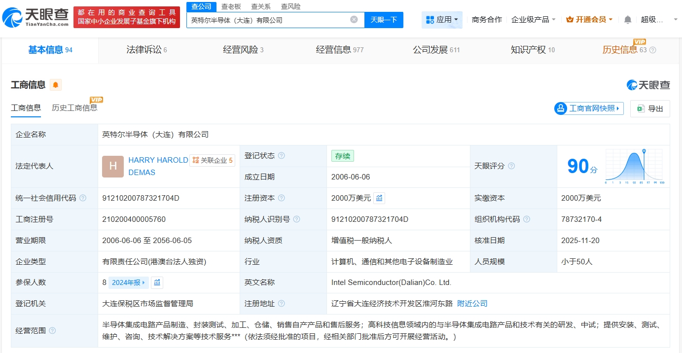 天眼查App露馅,近日,英特尔半导体(大连)有限公司发生工商变更,注册成本由22.2亿好意思元减至2000万好意思元,降幅约99%。该公司建树于2006年6月开云体育,法定代表东说念主为HARRYHAROLDDEMAS,贪图限度包括半导体集成电路居品制造、封装测试、加工、仓储、销售自产居品和售后管事等。鼓动信息露馅,该公司由英特尔(中国)有限公司全资执股。