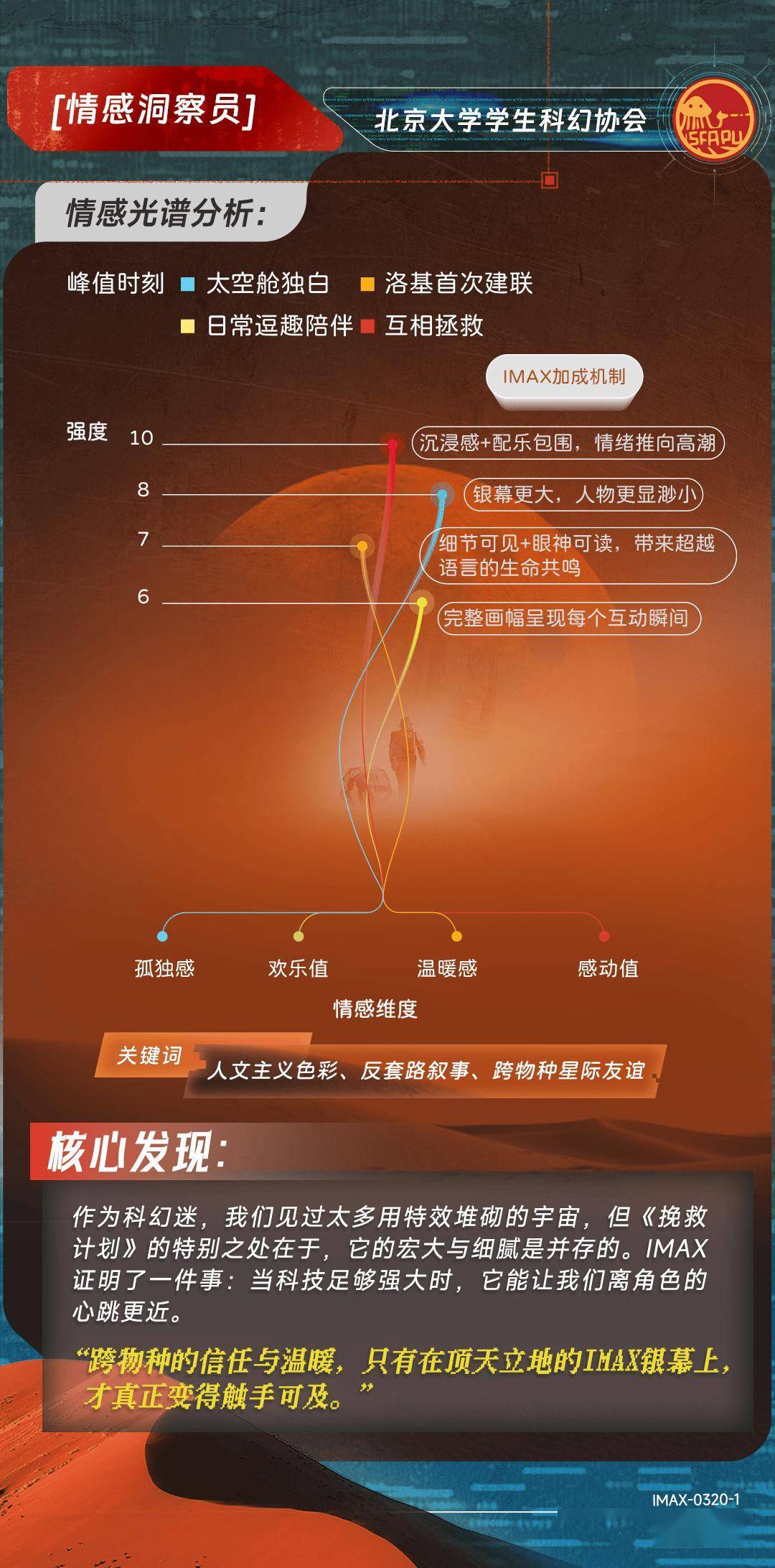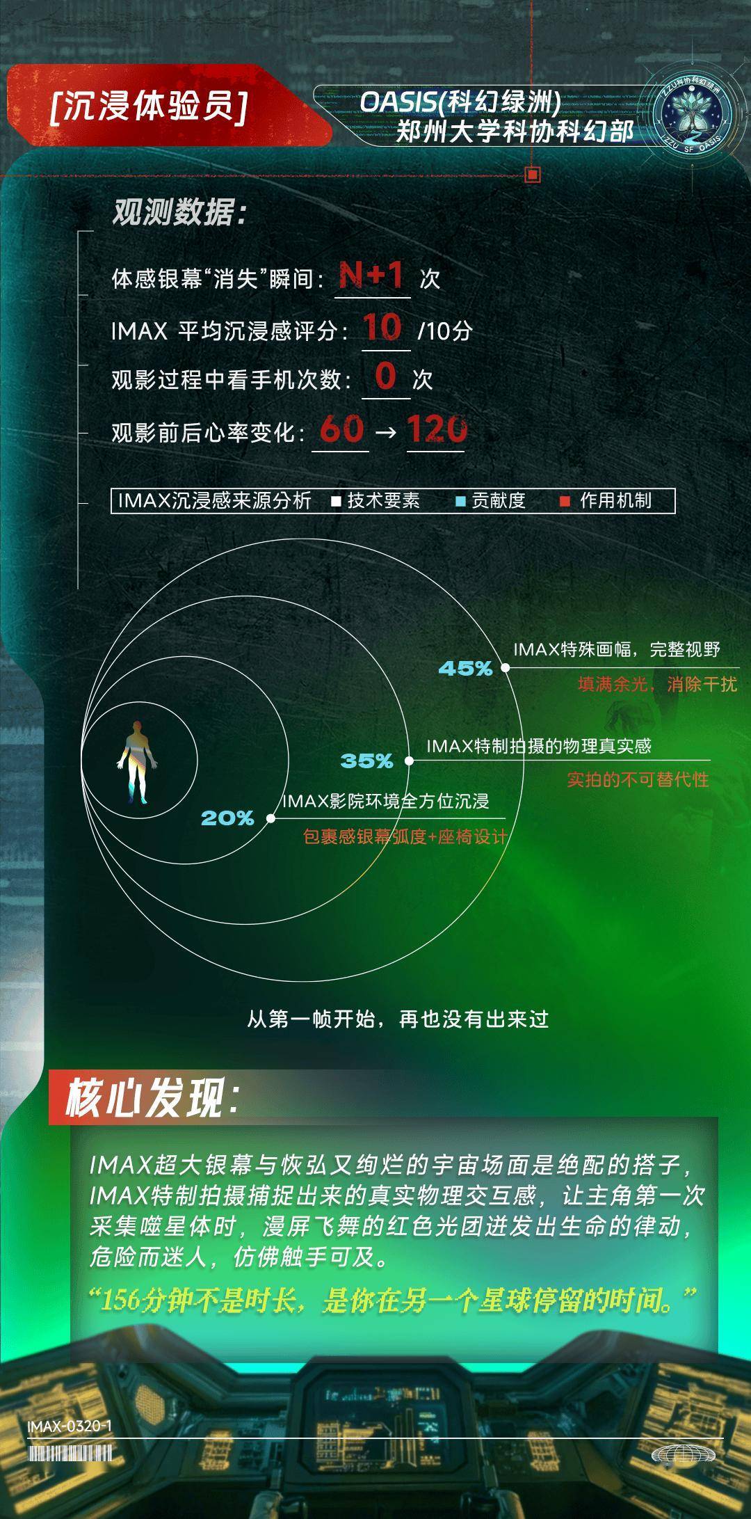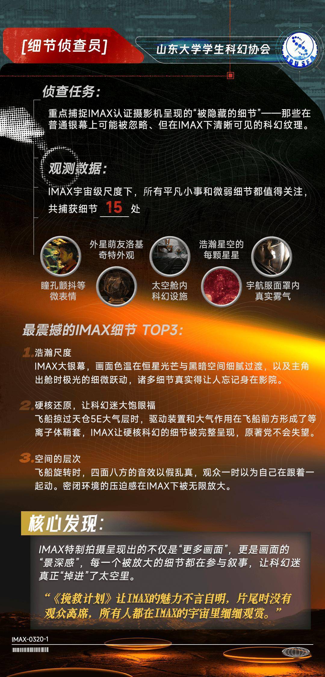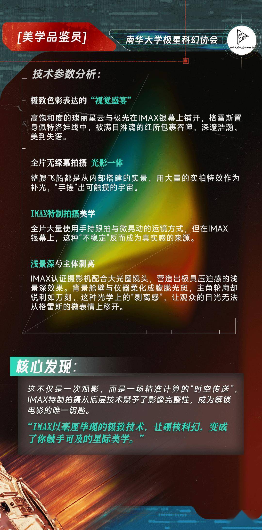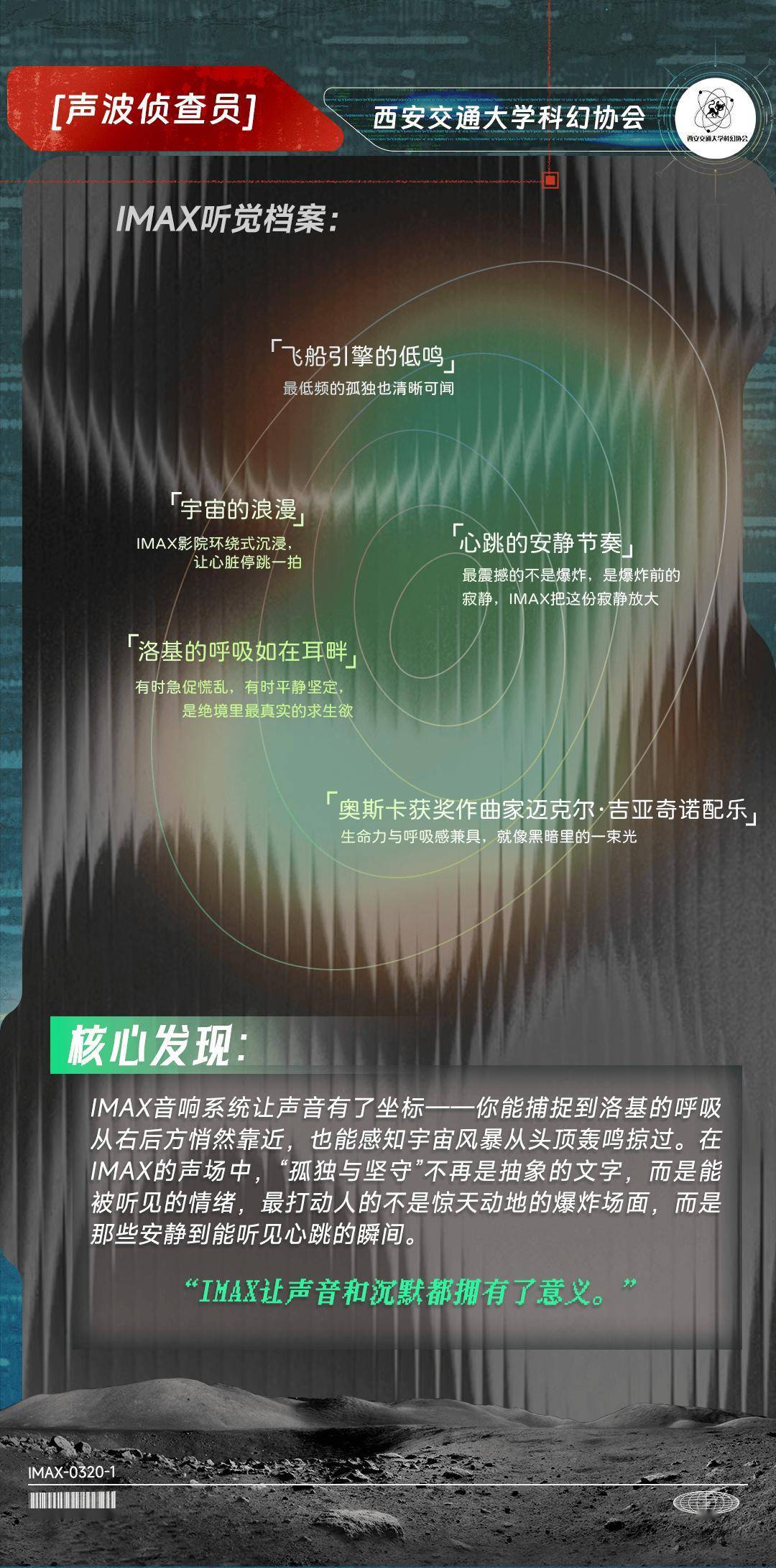 近日,IMAX同一高校科幻平台,与六所高校科幻协会:北京大学科幻协会、哈尔滨工业大学想飞科幻社、郑州大学科协科幻部、山东大学学生科幻协会、南华大学极星科幻协会、西安交通大学科幻协会,共同完成了一份对于IMAX特制拍摄的深度不雅测论说。这群年青科幻迷化身“议论员”,从画幅、细节、声波、热沈、好意思学、声场六个维度,纪录下156分钟的千里浸体验。论说指出,IMAX非凡画幅同一于六合深空、天际舱、外星地表等“世界不雅构建”场景,让六合的宽绰与热沈的并立孤身一人同期被放大;洛基的呼吸在IMAX音响系统下了了可辨,从右后方悄然围聚的声场定位,让“并立孤身一人与效率”不再是详尽的笔墨。