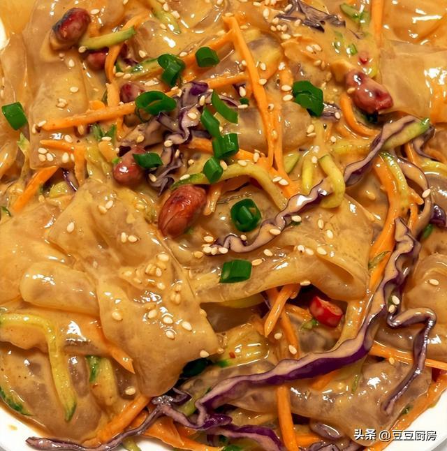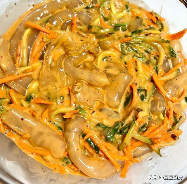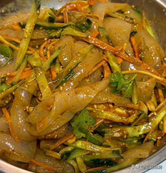 在外地,你可能吃过好多叫“东北拉皮”的东西,但说真话,大部分齐是工业活水线出来的干淀粉片,泡软了勉强吃。而在东北腹地,确凿的拉皮是一门技能。它必须是纯绿豆淀粉巧合土豆淀粉打出来的,安妥一个“透亮如玉,薄如蝉翼”。好的拉皮放在盘子里,你能透过它看清盘子下面的斑纹。