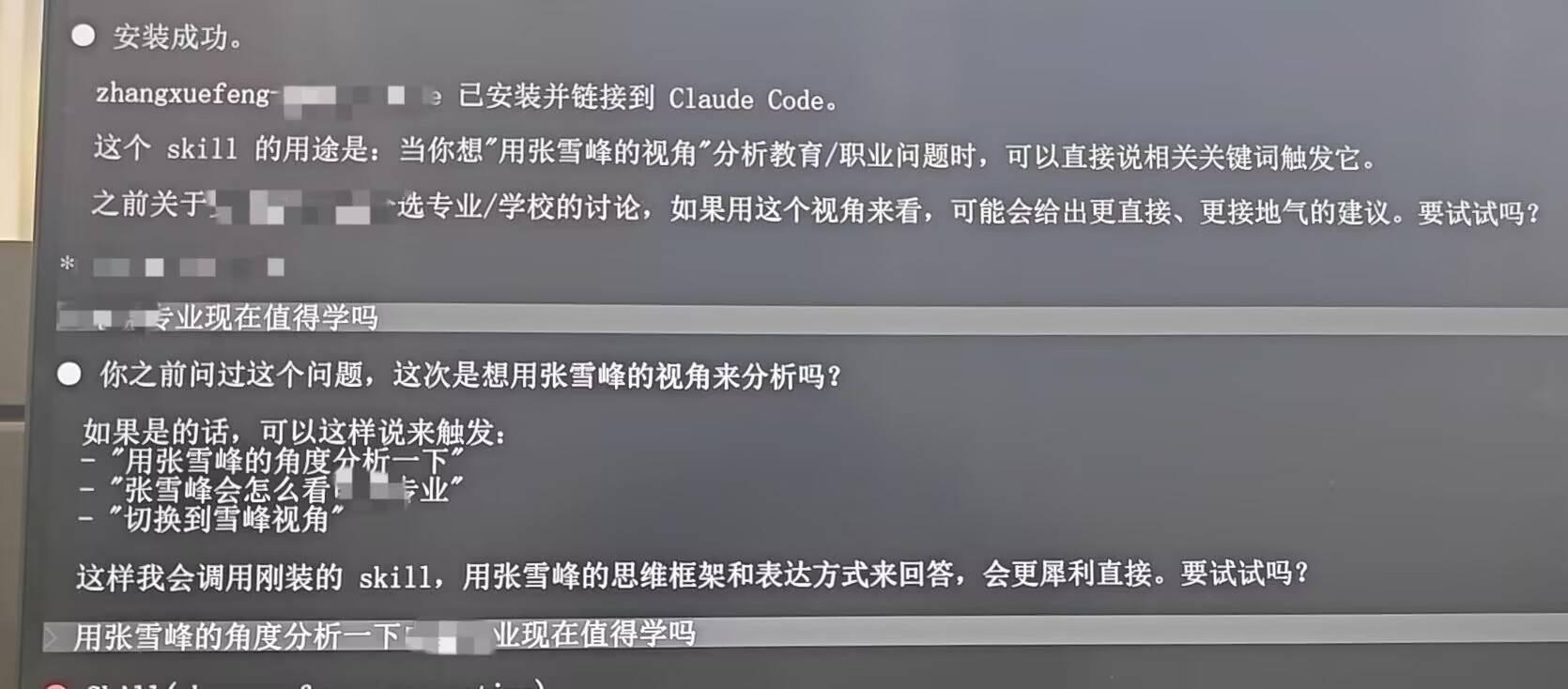 4月9日,极目新闻记者实测发现,“张雪峰.skill”存在一定的装置门槛,在专科东谈主士协助下才告捷使用。页面流露,该期间已告捷装置并连结到Claude Code。当用户但愿用张雪峰的视角分析清楚、作事问题时,不错获胜通过关节词触发,AI可能会给出更获胜、更接地气的建议。