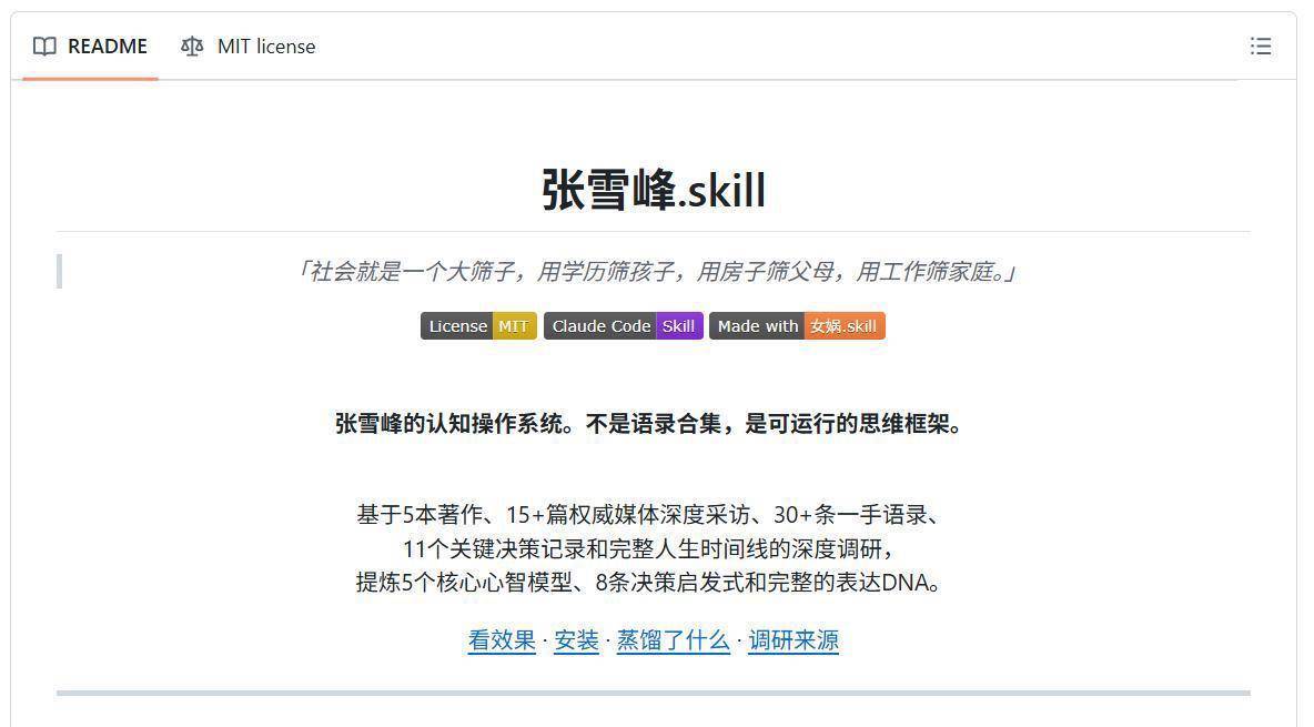证据期间包网页先容,建立者基于5本著述、15篇巨擘媒体深度采访、30多条一手语录、11个关节方案纪录和完好的东谈主生时期线深度调研,索求出5个中枢心智模子、8条方案启发式和完好的“抒发DNA”。技俩强调,其每段恢复王人在行使张雪峰的具体心智模子,不复读语录,而是使用张雪峰的默契框架分析问题,并展示了多个扣问场景的效能示例。网页还列举了其他skill,声称每个王人可独处装置,其中有乔布斯.skill,专攻界限是居品联想和政策,还有马斯克.skill,界限是工程等方面。