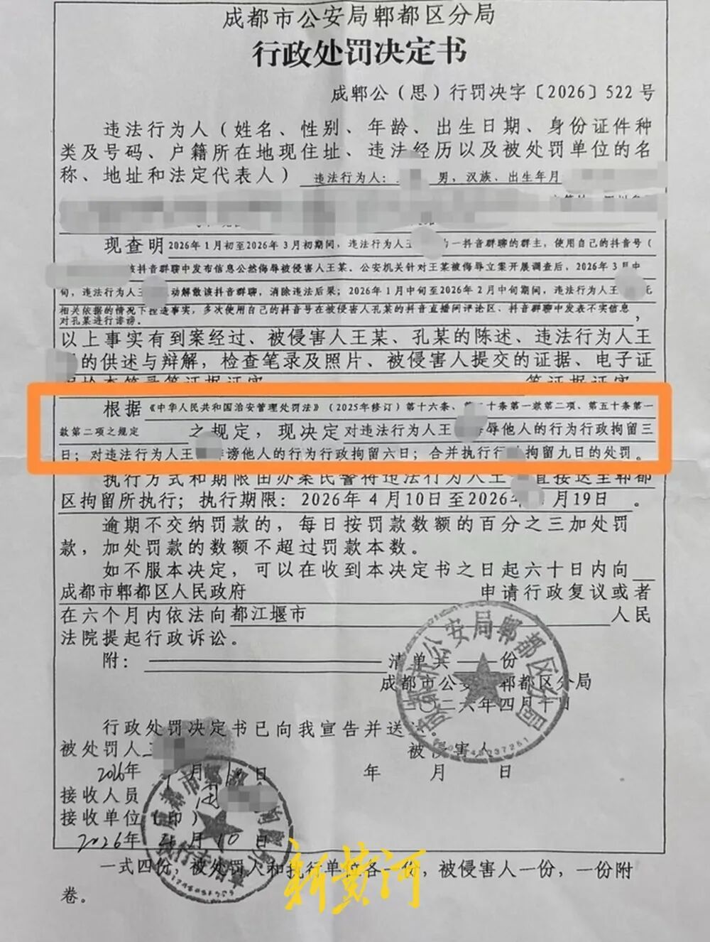 成齐市公安局郫齐区别局出具的《行政处罚决定书》裸露,2026年1月初至2026年3月初时期,违警孽为东谈主王某行动一群聊的群主,使用我方的账号在该群聊中发布信息公然侮辱被侵害东谈主王女士,公安机关针对王女士被侮辱立案开展访问后,2026年3月中旬,违警孽为东谈主王某主动肃除该群聊,搁置违警效果。此外,2026年1月中旬至2026年2月中旬时期,违警孽为东谈主王某在无相干依据的情况下合手造事实,屡次使用我方的账号在被侵害东谈主孔某的直播间研讨区、群聊中发表作假信息对孔某进行谴责。