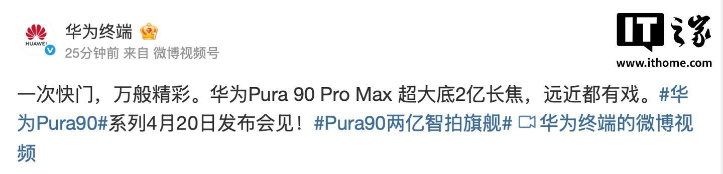 IT之家 4 月 14 日音讯,华为 Pura 90 系列及全场景新品发布会官宣定档 4 月 20 日,华为结尾当天预热,华为 Pura 90 Pro云开体育 Max 搭载超大底 2 亿长焦,遐迩王人有戏。